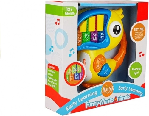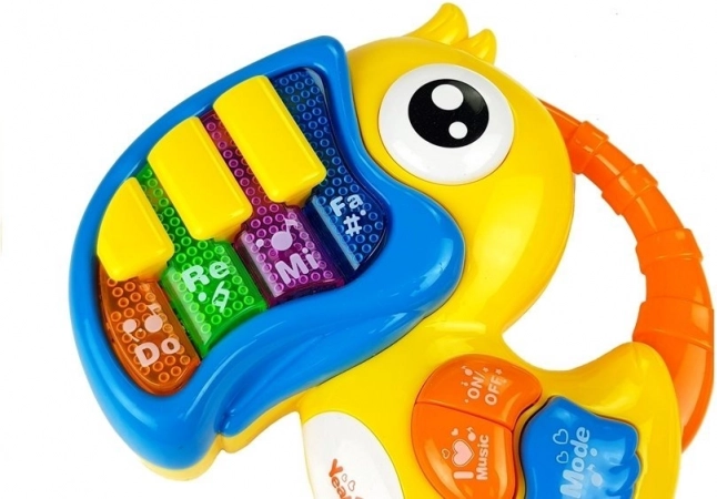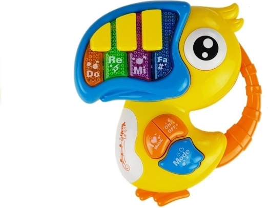 Interaktivno piano u obliku šarene ptice opremljeno je glazbenim tipkama 'Do', 'Re', 'Mi', koje oduševljavaju svako dijete svojom šarenoćom i veselom konstrukcijom. Zvučni i svjetlosni efekti pomažu u razvoju osjetila i mašte djeteta: