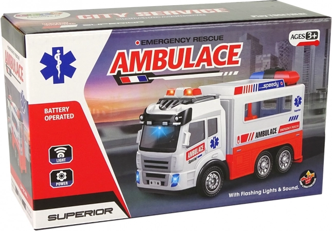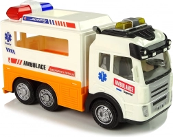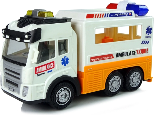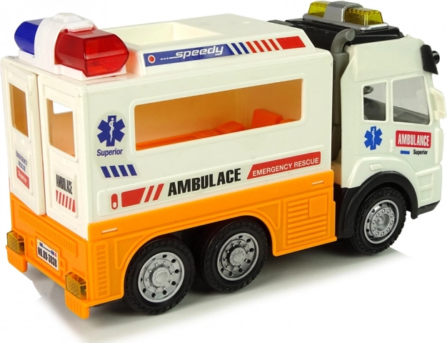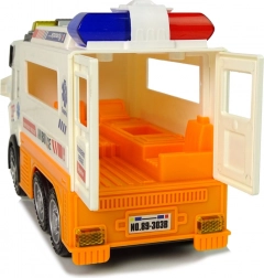 Ambulantno vozilo na baterije s efektima svjetla i zvuka oduševit će sve dječake koji vole vozila. Straga se mogu otvoriti vrata, iza kojih se nalazi detaljno izveden interijer s ležajem i mjestom za medicinsku opremu. Igračka je izrađena u lijepoj bijeloj boji s narančastim elementima i tipičnim natpisima za hitnu pomoć.