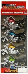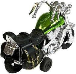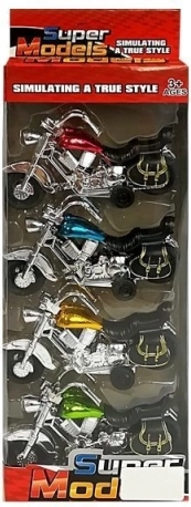Ovaj set sadrži četiri šarena modela motocikala u bojama ružičasta, plava, zlatna i zelena. Svaki motocikl izrađen je od izdržljivog materijala s funkcionalnim mehanizmom na navijanje: dovoljno je povući motocikl unatrag i pustiti, čime se pokreće naprijed. Zahvaljujući detaljnom dizajnu, ovi modeli privlače pažnju dječjih očiju i osiguravaju dugotrajnu zabavu.
