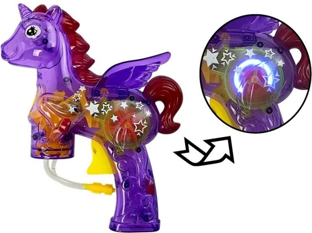 Pištolj za sapunicu u obliku jednoroga je magnet za dječju pozornost. Sadrži dvije zamjenske punjenja koja osiguravaju duge sate zabave. Kombinacija dizajna pištolja i motiva jednoroga čini ovu igračku originalnim pratiteljem pri svakodnevnoj zabavi.