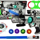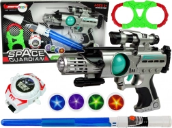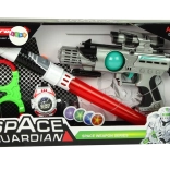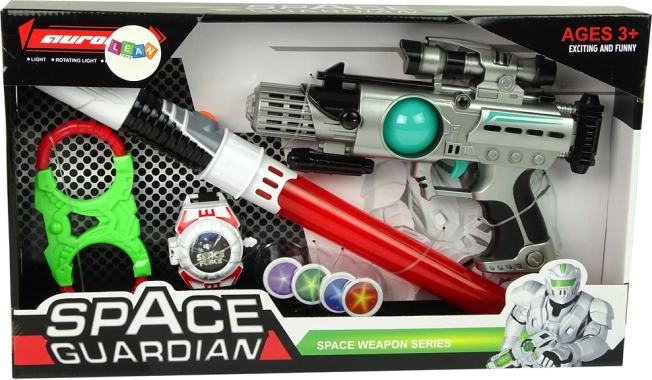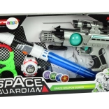 Set svemirskih oružja Space Guardian je kompletan paket za sve male avanturiste. Opremljen je ne samo laserskim pištoljem, već i svjetlosnim mačem, igračkom kampom i izbacivačem diskova za kompleksno igračko iskustvo. Zahvaljujući svjetlosnim i zvučnim efektima igra s ovim setom je privlačnija i kreativnija.