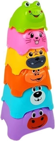 Šarena piramida je igračka koja odlično potiče razvoj vašeg djeteta. Sadrži kockice u različitim bojama s otiscima životinjica. Na vrhu piramide nalazi se najmanja kockica u obliku žabice. Kockice su izrađene od sigurnog, netoksičnog materijala koji je čvrst i izdržljiv.