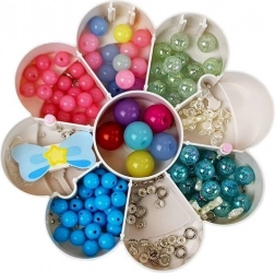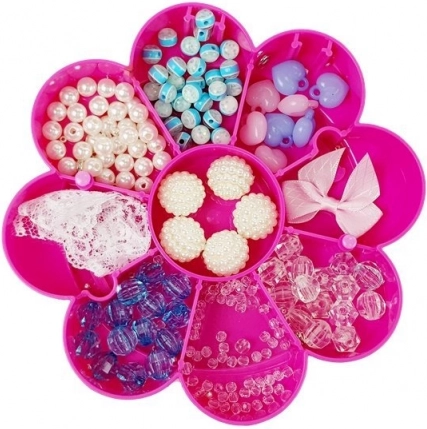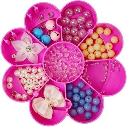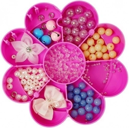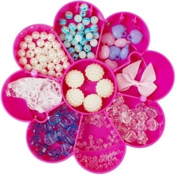 Praktičan koferčić u ružičasto-bijeloj boji ima oblik cvijeta i više pretinaca za pregledno razvrstavanje perlica i dodataka. Sve je uvijek spremno za kreativni rad.