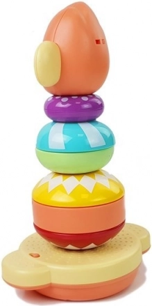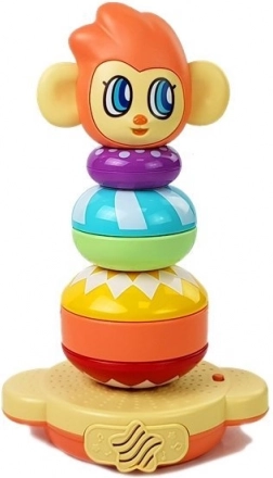 Edukativna piramida s motivom majmunčića nudi šarene prstenove različitih veličina koje djeca slažu na stabilnu bazu. Svaki pravilno postavljen dio pokreće engleske brojke, čime dijete prirodno povezuje igru s učenjem. Dovršena kula nagrađena je veselim pljeskom, što potiče motivaciju i radost zbog uspjeha.
