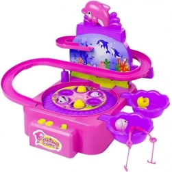 Ružičasti set za pecanje ribica klasična je igra vještine koja razvija reflekse, strpljenje i koncentraciju. Nakon umetanja baterija jezerce se počinje okretati, a ribice i pačići otvaraju i zatvaraju usta – vaš je zadatak spretno ih uloviti štapom ili mrežicom. Igra je idealna za dvoje djece, ali će zabaviti i jednog igrača.