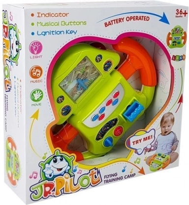 Volan u zeleno-narančastoj kombinaciji s realističnim dodacima simulira osjećaj pilota u kokpitu. Sadrži interaktivne elemente koji potiču motoričke vještine i maštu.