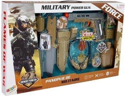 .Vojne igračke su obično jednostavno figurice vojnika koje imitiraju bojište ili kuglične puške. No, na valu popularnosti akcijskih filmova nastaje sve više igračaka koje se čak natječu u ponuđenim funkcijama. Imamo prijedlog koji će se odlično uklopiti i za maskenbal i za igru. S takvom opremom mališan će unijeti red i čistoću posvuda. Set za malog vojnika sastoji se od mnogih elemenata. Svi su izrađeni od visokokvalitetne plastike, što jamči da će vašem djetetu dugo služiti. Ukupna koloristika je tamnozelena. Oružje proizvodi zvuk pucnja već samim pritiskom na okidač. Zvuk se čuje i pri punjenju. Tijekom tih radnji mogu se primijetiti svjetlosni efekti na oružju. Nijedan lopov vam neće pobjeći! Mašta mališana zasigurno će se razviti. Najveća prednost vojnog seta je njegova veličina i broj dijelova. Uz pomoć ovih elemenata može se složiti tako da podsjeća na vojnu opremu. Zahvaljujući priboru, dijete se može opremiti radio-stanicom, kompasom i mnogim drugim predmetima, kao i naoružati plastičnim nožem.