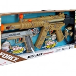 Zabavni vojni set za male entuzijaste uključuje dva pištolja (veliki i mali/„revolver“), slušalice s mikrofonom za komunikaciju i zviždaljku. Veliki pištolj proizvodi realistične zvukove pucnjave i ima svjetlosne efekte, a manji pištolj reproducira pojedinačne hitce i zvuk repetiranja. Sve je izrađeno od kvalitetne plastike, idealno za igru, karneval ili kostimiranu zabavu.