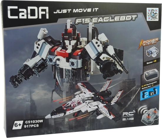 Ovaj 2u1 CADA set oduševit će sve male inženjere od 6 godina naviše. Od čvrstih i sigurnih dijelova složit ćete ili artikuliranog robota sa daljinski upravljanim kretanjem naprijed/natrag i lijevo/desno, ili realistični lovac F15 s otvarajućim kokpitom i elementima za akcijsku igru. Pregradnja između modela je jednostavna i potiče na daljnje otkrivanje i slaganje.