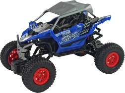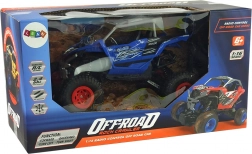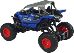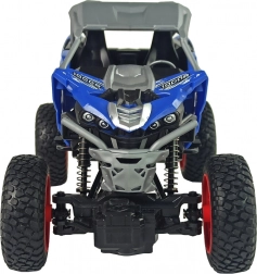 Plavi terenski automobil opremljen je velikim, crvenim kotačima i ovjesom za vožnju po bilo kojoj podlozi. Njegova plastična konstrukcija osigurava izdržljivost.