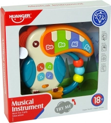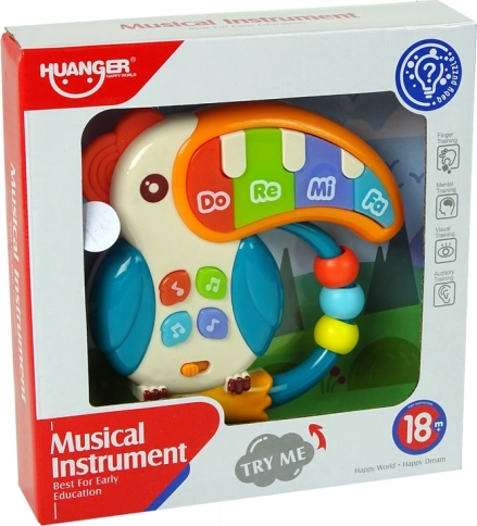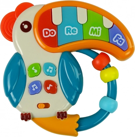 Glazbeno pianko u obliku papige idealno je za razvoj dječjih osjetila. Zahvaljujući 5 obojenih tipki DO RE MI FA sa svjetlosnim efektima djeca mogu uživati u raznim melodijama i zvučnim efektima, što jača njihovu sposobnost razlikovanja zvukova. Mala tipkala u obliku nota aktiviraju dodatne funkcije, poput različitih zvukova i melodija.