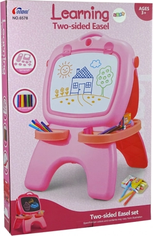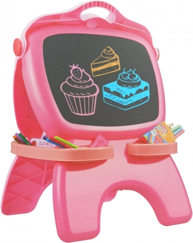 Otkrijte dvostranu magnetnu i krednu ploču koja potiče kreativnost i učenje. Bijela strana je za brisive markere, crna za kredu. U kompletu su 12 markera i 12 kreda, šablone oblika i slova, svjetleći flomaster, praktična ladica za dodatke i kuka za papir. Kompaktne dimenzije 64×44×30 cm. Prikladno od 3 godine, u skladu s EN71 i CE.