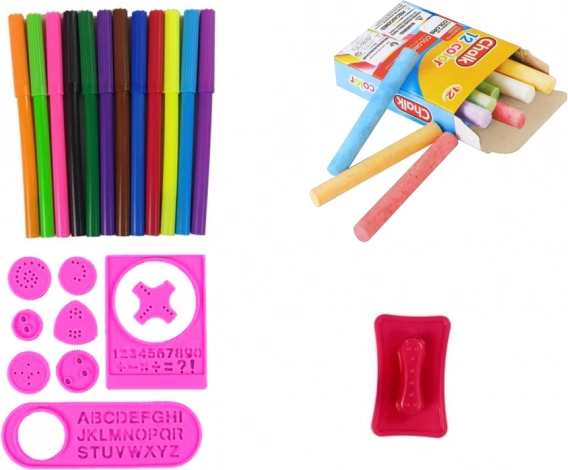 - Ploča, 12 markera, 12 kreda, šablona s oblicima, šablona sa slovima, svjetleći flomaster