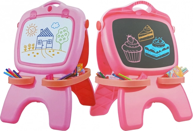 Ploča ima dvije površine: bijelu magnetnu za brisive markere i crnu krednu. Praktična ladica drži sav pribor pri ruci, dok kuka za papir omogućuje pričvrstiti list i crtati kao na stalku. Stabilne dimenzije 64 × 44 × 30 cm i visina površine 30 cm prilagođene su djeci od 3 godine.