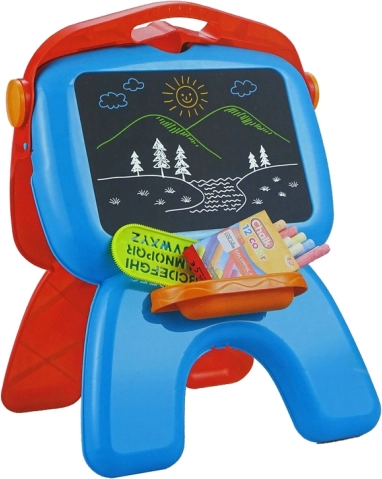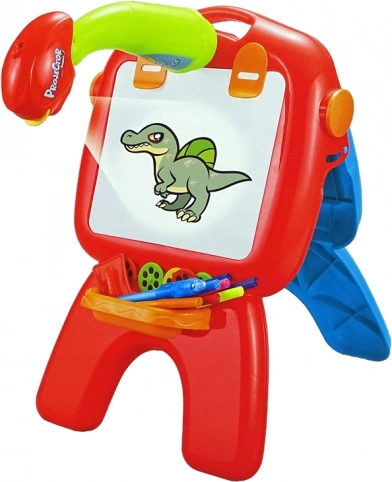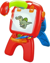 Dvostrani stalak za crtanje promišljen je pratitelj za male umjetnike. Djeca mogu pisati i slikati na bijelu brisivu površinu ili stvarati kredom na crnoj ploči. Gornji projektor projicira motive koje je lako precrtati – idealno za prve korake u crtanju, vježbu oblika i slova.