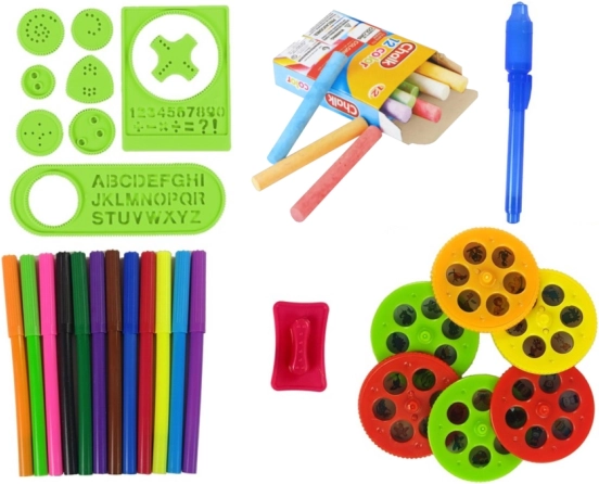 Dio paketa je bogat set dodataka: 36 šablona slika, 6 diskova s motivima, 12 kolor flomastera, 12 kolor kredu, šablone geometrijskih oblika i slova te poseban flomaster s UV svjetlom koji nakon osvjetljavanja otkriva što je dijete nacrtalo. Praktični pretinci drže sve pri ruci i olakšavaju red.