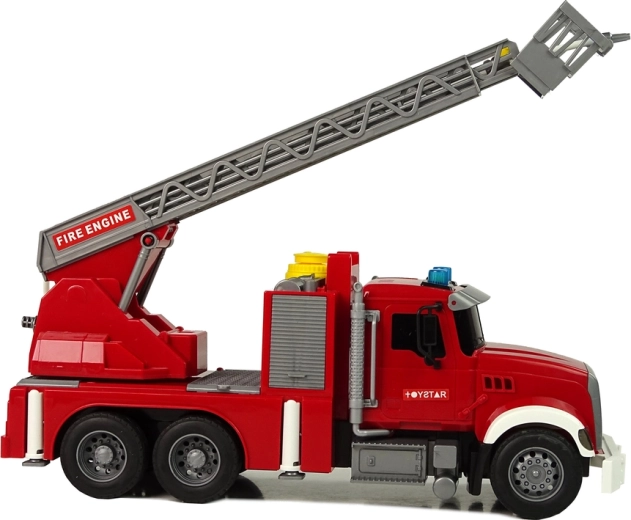 Vozilo na gornjem dijelu kabine ima žuti otvor kroz koji se lako može uliti voda. Kada ga nekoliko puta pritisnete, vidjet ćete kako voda istječe iz crijeva postavljenog na predviđenom mjestu. Vaš mali pomagač spreman je za akciju! Pritisnite gumb na gornjem dijelu spremnika i promatrajte kako voda počinje istjecati! Može ugasiti male požare. Ljestve se podižu pomoću ručice.