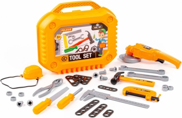 Dječji set alata osmišljen je za male majstore koji žele oponašati mamu ili tatu pri radu u radionici i u vrtu. Svi elementi izrađeni su od izdržljive plastike, sigurni su za igru i lako se pospremaju u čvrsti kovčeg. Brusilica nakon pritiska na gumb okreće disk, a zaštitna maska ima elastičnu gumicu pa pristaje svakome.
