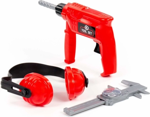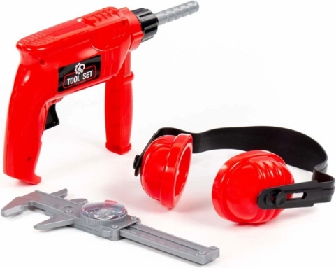 Dječji set alata – crvena bušilica, štitnici za sluh i pomično mjerilo