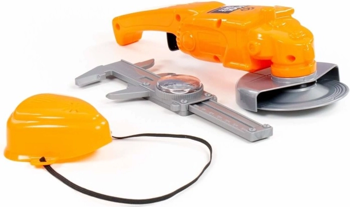 U ovom setu nalazi se brusilica; pritiskom na gumb disk se počinje okretati. Kako bi se mali majstor zaštitio od prašine ili nečistoća, može nositi masku. Mjerilo će vam pak omogućiti precizno mjerenje obrađivane površine. Cijeli set je narančaste boje, savršeno prilagođen malim ručicama. Set će mnogim malim pomagačima pružiti puno zabave u uradi-sam igrama.