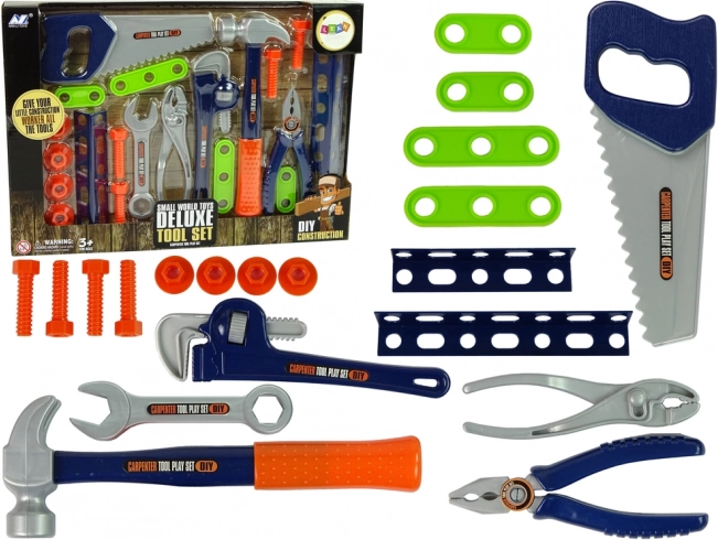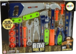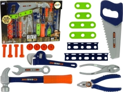 U pakiranju se nalazi sve što malom majstoru treba: čekić, pila, francuski ključ, kliješta (2 kom), razni ključevi, podloške, kutnici, vijci (4 kom) i matice (4 kom). Djeca mogu graditi jednostavne konstrukcije, vježbati zavrtanje vijaka i oponašati odrasle pri majstorskim radovima.