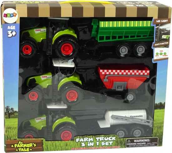 Set za male farmere donosi tri detaljno izrađena traktora i tri različite prikolice: cisternu za vodu, korpu za žito i kolica za stočnu hranu. Djeca se na zabavan način upoznaju s time kako rade poljoprivredni strojevi i koji se poslovi obavljaju na farmi.