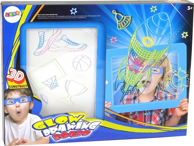 Otkrijte zabavnu i edukativnu igračku za djecu: magičnu neonsku 3D ploču u plavoj boji. Zahvaljujući podsvjetljenju vaše će crteže oživjeti, s priloženim neonskim flomasterima stvorit ćete sjajne slike, a s 3D naočalama vidjet ćete dojmljiv prostorni efekt. Ploča se lako čisti, odlična je za dom i putovanja te potiče kreativnost i finu motoriku.