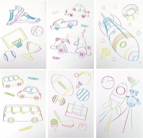 U pakiranju se nalaze 4 neonska flomastera, krpica za čišćenje i dvosrane šablone za lako precrtavanje i brzi početak.