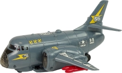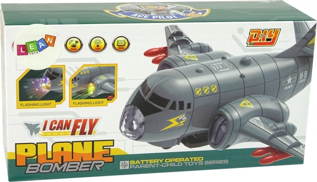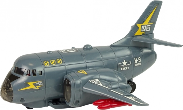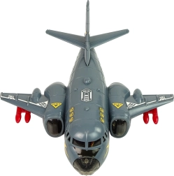 Ovaj interaktivni bombarder je idealan za ljubitelje vojske i zrakoplovstva. Sivi dizajn s crvenim raketama daje autentičan vojni izgled. Igračka je izrađena od izdržljive plastike i sadrži šarene diode koje svijetle na trupu i krilima, uz realistične zvučne efekte poput startanja i pucanja.