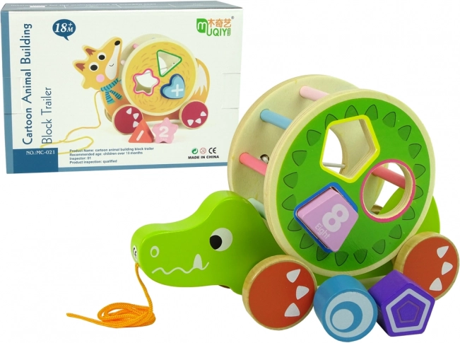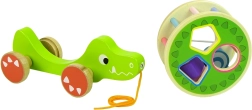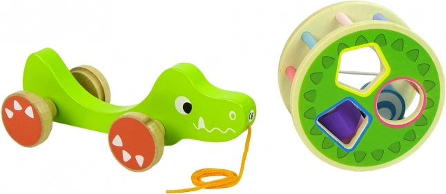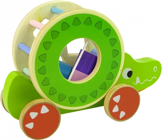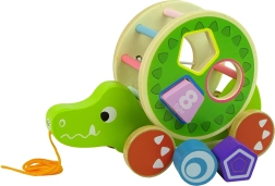 Drvena igračka krokodil sa sorterom nudi niz obrazovnih elemenata. Veliki krug sa sorterom i tri bloka na leđima omogućuju vježbanje preciznosti, prepoznavanje geometrijskih oblika te poboljšavaju koncentraciju i logičko razmišljanje. Krokodil je opremljen šarenim štapićima koji stimuliraju djetetov vid, a kotači s užetom olakšavaju kretanje igračke. Blokovi unutra funkcioniraju kao zvečkica, što privlači djecu i potiče njihove slušne osjete. Odvojivi prsten na leđima krokodila omogućuje više varijanti igre.