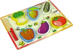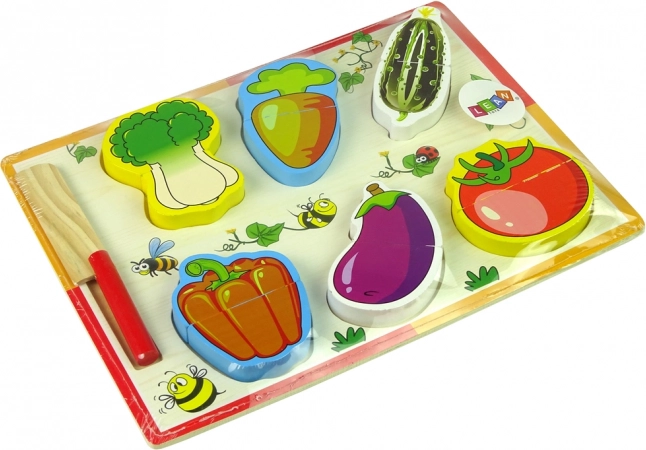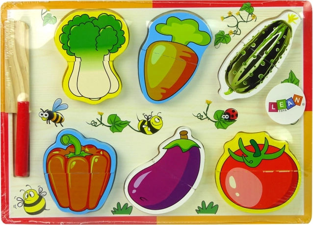 Ovaj šareni drveni set povrća podijeljen je na polovice i spojen tako da se može lako “rezati” priloženim nožićem na daski. Zahvaljujući oblikovanim udubinama na daski, djeca vježbaju koordinaciju oko–ruka i uče pravilno sparivanje oblika. Igra kuhara potiče kreativnost, igre uloga i zdrave prehrambene navike.