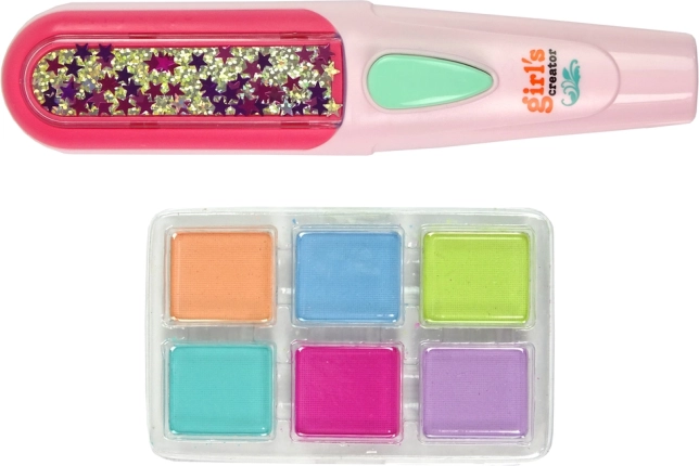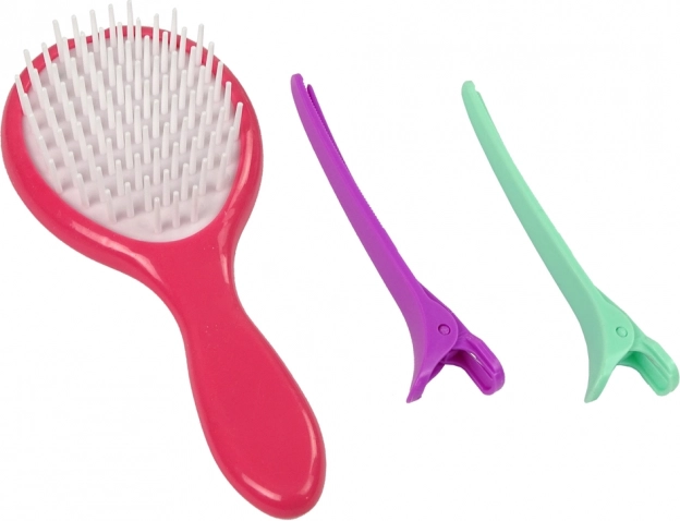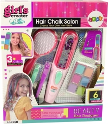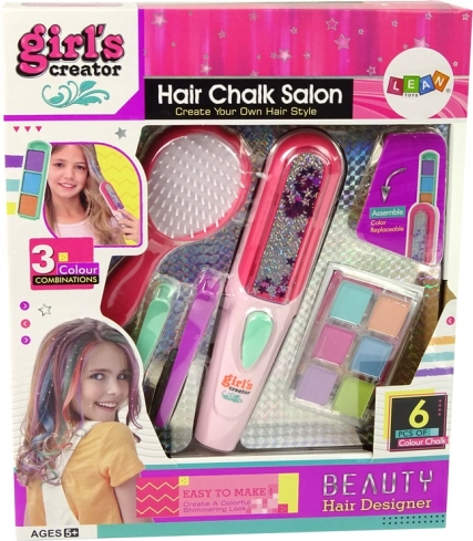 Upoznajte set koji sadrži četku, mini peglu, dvije šnalice i šest kreda u boji za kosu.
