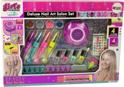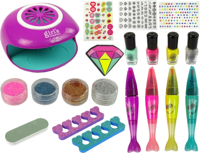 .Nakon izjednačavanja duljine i oblika noktiju dijamantnom rašpom, nanesite na nokte odabranu boju. Sljedeći korak je stavljanje ruke u posebnu lampu namijenjenu noktima. Nakon stavljanja ruke upalit će se svjetlo kao kod pravog uređaja. Olovke omogućuju precizno oslikavanje uzoraka i dolaze u dvije boje. Slikanjem uzoraka djevojčica razvija preciznost i stvara vlastiti stil. Naljepnice, dijamanti i šljokice daju originalnost i sjaj.