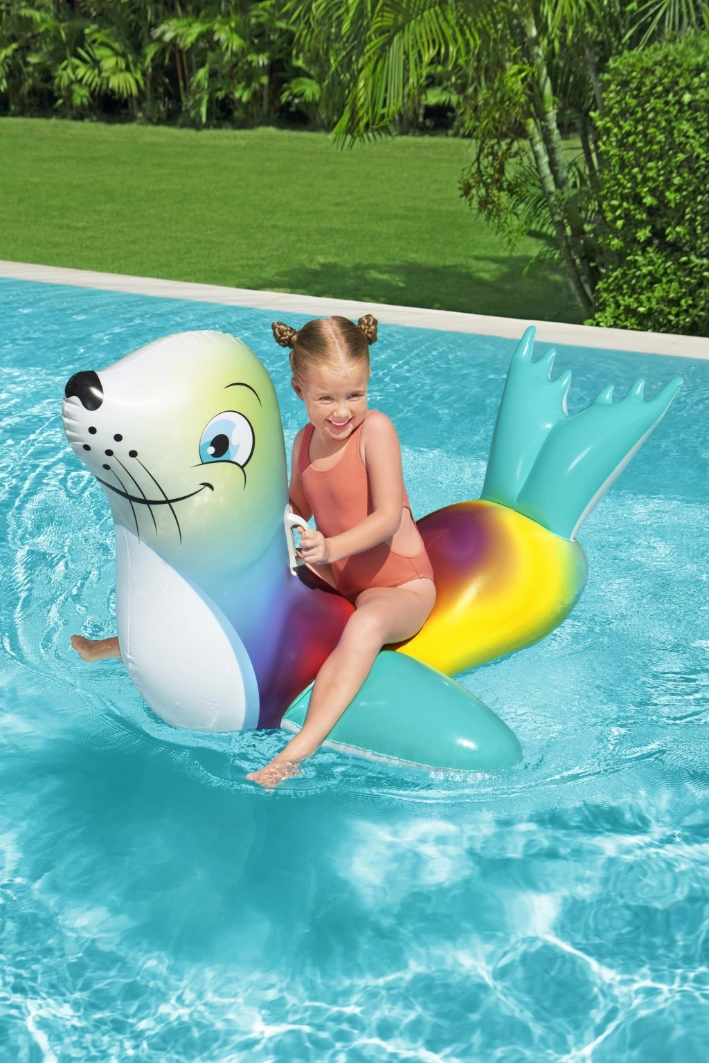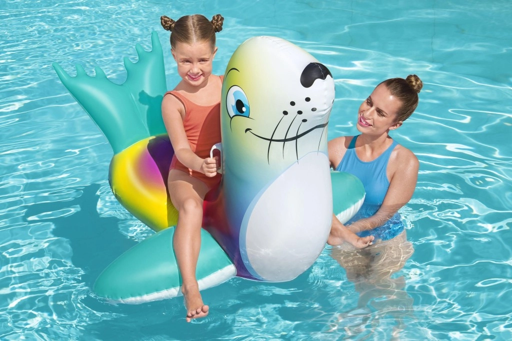Uživajte u bezbrižnim ljetnim radostima s šarenim napuhanim tuljanom, idealnim za djecu od 3 godine. Dvije praktične ručke osiguravaju siguran hvat i bolju ravnotežu, dok glatka, izdržljiva površina pruža udobnost pri igri i opuštanju na vodi.