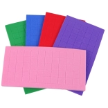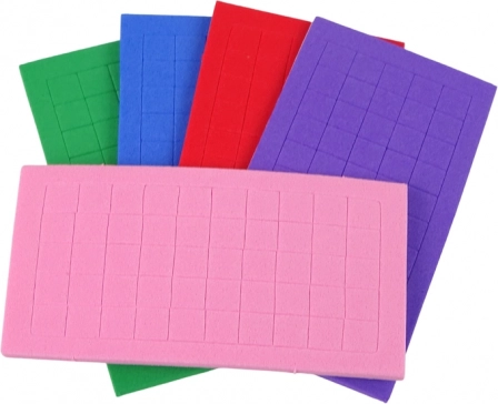 Set sadrži šarene pjenaste kvadratiće u pet različitih boja: ružičastoj, ljubičastoj, plavoj, crvenoj i zelenoj.