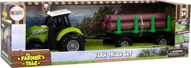 Ovaj zeleni traktor s odvojivom prikolicom i plastičnim trupcima donosi djeci autentičan doživljaj farme. Pritiskom na gumb aktiviraju se zvukovi motora i vožnje, prednji reflektor osvjetljava put, a realistično izvedenje potiče maštu i kreativnu igru.