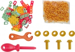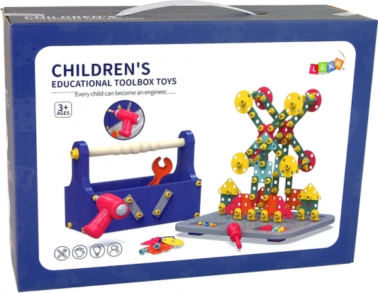 Sadržaj pakiranja: alatni kofer za sastavljanje, akumulatorski odvijač na baterije, konstrukcijska ploča, ravni ključ, odvijač, veliki set matica i vijaka, ravni dijelovi u oblicima geometrijskih figura.