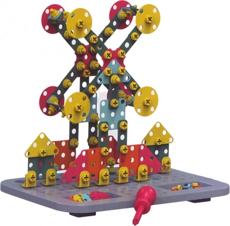 Ovaj bogati STEM set potiče učenje kroz igru – djeca usvajaju osnove tehnike, inženjerstva i matematike pri osmišljavanju vlastitih modela. Zahvaljujući sigurnom akumulatorskom odvijaču na baterije rad je gladak i zabavan, bez potrebe za utičnicom. Ravni dijelovi i konstrukcijska ploča omogućuju stvaranje šarenih uzoraka i jednostavnih mehanizama.