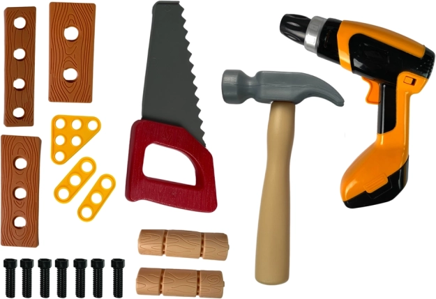 Dio kompleta je širok raspon alata i dodataka: imbus i viljuškasti/odvijački ključevi, steg, pila, kliješta, čekić, odvijači, vijci i matice, zupčanici, drvene (plastične) pločice za zavrtanje, bočne kutije za sitnice i vješalice za organizaciju alata. Radionica se lako montira i demontira te zauzima minimalno mjesta.