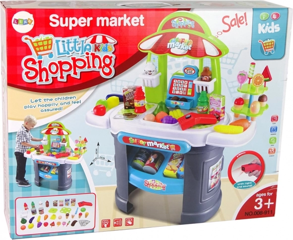 Ručni skener pri očitavanju proizvoda emitira zvuk „bip” i crveno svjetlo, čime igri daje autentičnost. Set uključuje blagajnu, novčanice i kovanice, štand sa slatkišima, makete namirnica i pića te niz kartonskih i plastičnih ambalaža. Kvalitetna izrada i certificirani materijali osiguravaju sigurnu igru za djecu od 3 godine.