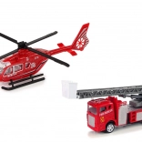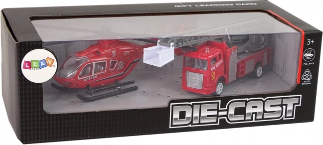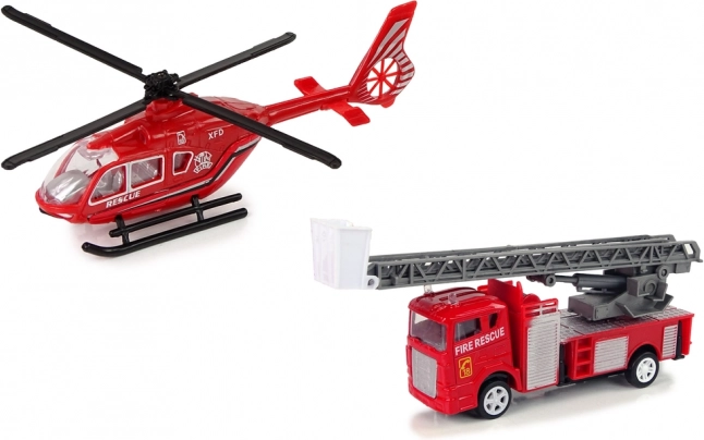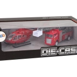 Set sadrži dva vatrogasna vozila i helikopter te šest kartica s različitim vozilima. Dimenzije igračaka omogućuju jednostavno rukovanje i najmanjim ručicama.