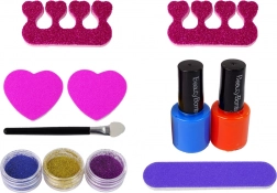 Višebojni set lakova za nokte i raznih, šarenih naljepnica. Klasične naljepnice s uzorcima omogućit će vam stvoriti prekrasnu manikuru koju je moguće brzo i neinvazivno ukloniti običnim odstranjivačem laka. Šljokice će vašim noktima dati sjaj i efekt. Lampa će učvrstiti lak na noktima, a glodalica će se pobrinuti za kožicu oko nokta.