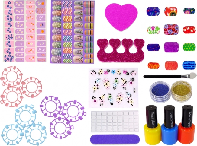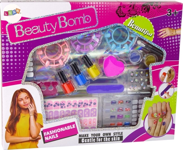 Ovaj set sadrži nekoliko šarenih lakova za nokte i raznobojne naljepnice. Klasične, s uzorkom i sa šljokicama omogućuju lijepo lakiranje noktiju te njihovo brzo i jednostavno uklanjanje običnim odstranjivačem laka.