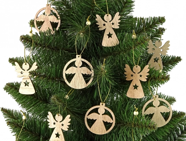 Elegantni set od 12 drvenih anđelčića za ukrašavanje božićnog drvca. Prirodan izgled, fina izrada i vrpca za vješanje oduševit će ljubitelje tradicionalnog Božića. Ukrasi su lagani i izdržljivi, prikladni i za kućanstva s djecom (od 3 godine).
