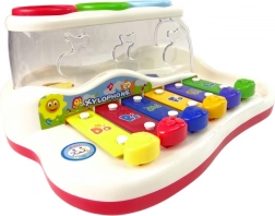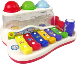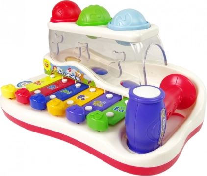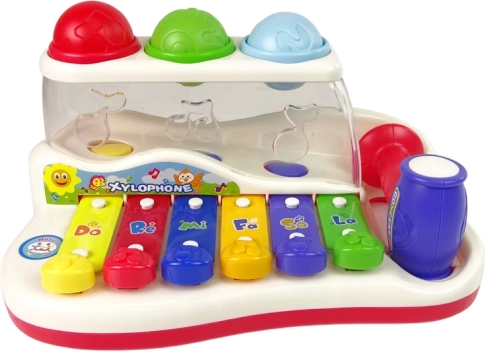Ovaj šareni dječji ksilofon spaja glazbenu igračku i zabavnu stazu za loptice. Tipke u živim bojama pri dodiru proizvode ugodne tonove, a dijete kroz igru uči razlikovati zvukove, ritam i jednostavne melodije. Šarene loptice može udarati čekićem i promatrati njihov put koji završava sa strane igračke – to motivira na daljnju igru i vježba koordinaciju oko–ruka.