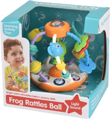Ova šarena interaktivna kugla idealno je pomagalo za cjelovit razvoj beba. Zahvaljujući različitim oblicima, bojama, zvukovima i svjetlu, stimulira vid, sluh i dodir te prirodno razvija logičko razmišljanje. U sredini se krije vesela žabica koja se pri protresanju njiše gore-dolje, a na vrhu se nalazi rotirajuća kuglica za dodatno istraživanje.