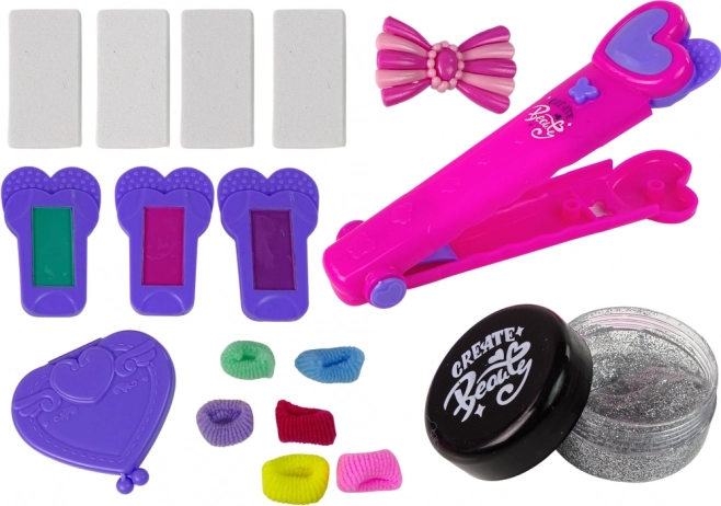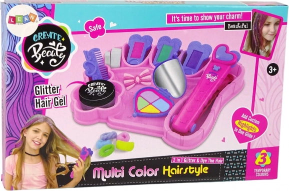 Osim obojenih pramenova, frizura se može obogatiti i drugim priborom iz seta, kao što su šarene gumice, ukosnica u obliku mašne, češalj, izmjenjivi sunđerčići za peglu i gel sa šljokicama. Sve je organizirano na podlozi za udobnu i laganu igru.