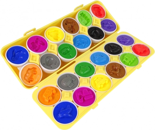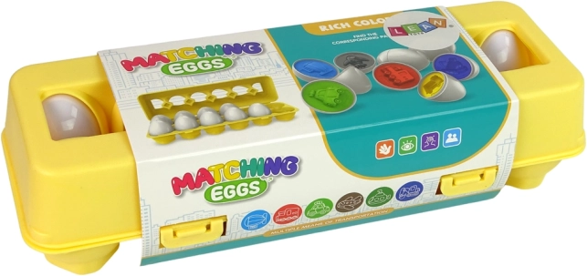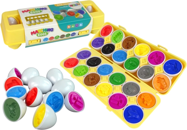 Zabavna edukativna igra za djecu: set od 12 jaja s motivom vozila, koja se spajaju i razvrstavaju prema obliku i boji. Potiče finu motoriku, koordinaciju oko–ruka i logičko razmišljanje. Izrađeno od sigurnih, izdržljivih materijala, u praktičnoj kutiji na zatvaranje u obliku pladnja za jaja.