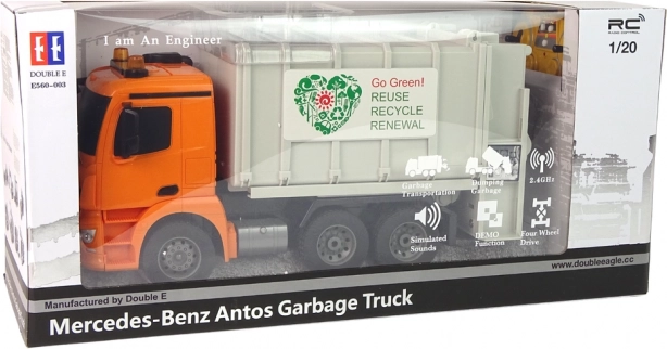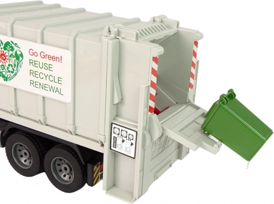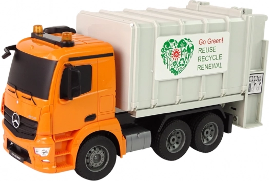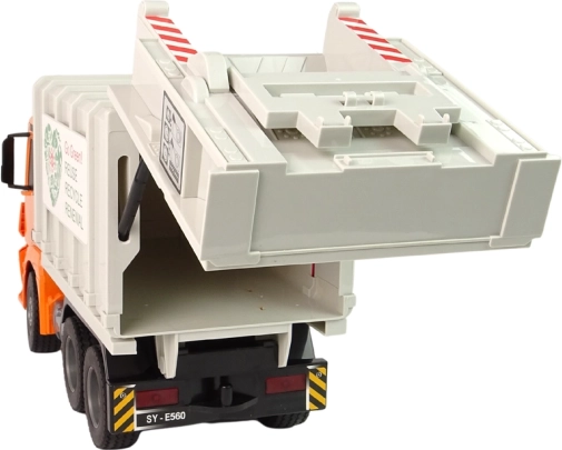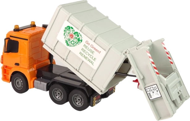 Učite djecu razvrstavanju otpada na zabavan način. Ovaj detaljno izrađen model kamiona za smeće s narančastom kabinom i bijelim kontejnerom sa zelenim reciklažnim elementima nudi glatku vožnju naprijed/natrag i skretanje zahvaljujući pouzdanom daljinskom upravljaču 2,4 GHz. Tijekom vožnje prate ga realistični svjetlosni i zvučni efekti, uključujući karakteristični signal pri vožnji unatrag.