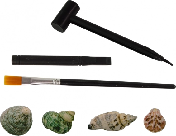 Dio pakiranja su sigurni alati za male arheologe: dleto, čekić i kistić. Djeca će uvježbati preciznost, strpljenje i manuelnu spretnost te mogu postupno stvoriti vlastitu kolekciju školjki. Na ambalaži se nalaze prikazi mogućih modela (npr. školjka pregrzebak, zeleni puž, turridae, puž s crnim ustima, puž s crvenim bojama), pa je prepoznavanje jednostavno.